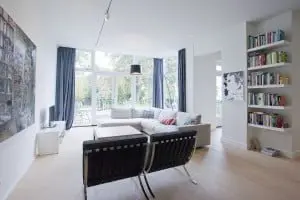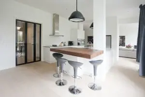 Het belangrijkste element van het ontwerp is een in notenhout uitgevoerde kubus met rondom beloopbaar glas. De kubus staat op de kelderverdieping en steekt door de begane vloer heen. In de woonkamer vormt de kubus een verhoogd plateau. Het beloopbaar glas ligt op het vloerniveau van de woonkamer. De kubus bepaalt door haar afmeting en positionering de nieuwe ruimteverdeling van de woning. De woonkamer krijgt hierdoor een duidelijk voor en achtergedeelte.
