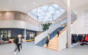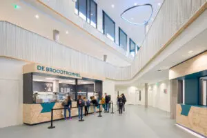 Wie het gebouw betreedt, stapt een oase van licht, lucht en ruimte binnen. Van Leeuwen legt uit: “We hebben in dit ontwerp bovengemiddeld veel aandacht gegeven aan licht en lucht. Overal ervaar je daglicht, doorkijkjes en lange zichtlijnen die uitlopen in de buitenruimte. Het is zo een open en zeer transparant gebouw geworden.” Wat bijdraagt aan die ervaring is de ruimtelijke indeling. Van Leeuwen en zijn team hebben niet gekozen voor één centrale aula, maar voor een sequentie van ruimtes die op een mooie manier in elkaar overvloeien.