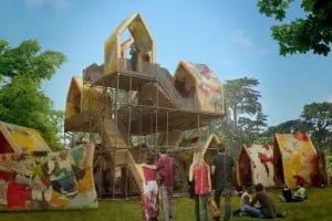 Floor heeft samen met medestudenten Alice Jansen en Marthe Doornbos het ontwerp technisch en architectonisch uitgewerkt. Het ontwerp is een soort dorp, en bestaat uit dertig modules die tot vijftien huisjes worden geschakeld. Floor maakte een constructie van steigermateriaal en hergebruikt hout. De blikvanger van het paviljoen is de bekleding. Van shampooflessen is plaatmateriaal gemaakt. Zestig flessen zijn in stukjes geknipt en gesmolten in een tosti-apparaat, tussen bakpapier. Het resultaat waren mooi gekleurde platen.