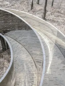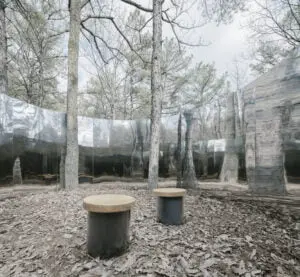 Hoe dichter de bezoeker bij het middelpunt van het paviljoen komt, hoe meer hij of zij wordt gedwongen de drie eenzame bomen waar te nemen. Hij of zij wordt onderdeel van een nieuw bos dat zich ontvouwt in de spiegelende wanden aan de binnenzijde van het paviljoen. Door in een ronde beweging over het pad naar buiten te lopen, lijken de bomen zich weer aan te sluiten bij het ‘echte’ bos.