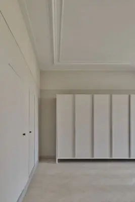 Waar de meeste historische kasten randloos in de wand zijn ingebouwd, staan de nieuw ontworpen kasten juist als zelfstandige meubels in de ruimte. Zo werd ook de keuken, oorspronkelijk ondergebracht in het souterrain, verplaatst naar de bel-etage en vormgegeven als twee vrijstaande maatwerkobjecten. De nieuwe interieurbouw kenmerkt zich door een duidelijke verticale geleding, die een vanzelfsprekende aansluiting vormt met de neogotisch geïnspireerde architectuur van Houtzagers.