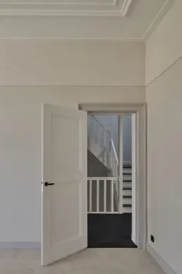 De royale plafondhoogtes vormden aanleiding voor het introduceren van een nieuwe datumlijn: een horizontale referentielijn die de hoogte bepaalt van nieuwe wandafwerkingen en toegevoegde interieurelementen. Deze visuele lijn verbindt de verschillende tijdslagen en loopt consequent door in zowel de historische kamers als de nieuwe keukens en badkamers. Ook het zorgvuldig gekozen kleurenpalet van behang, schilderwerk en tegelafwerkingen zorgt voor samenhang tussen oud en nieuw, met op iedere verdieping een subtiel eigen sfeer.