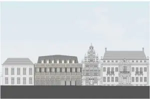 Het voorgebouw aan het Grote Kerkhof heeft twee lagen met een kap en een sterke verticale belijning, net als de buren links en rechts: ‘de Hereeniging’ en het stadhuis. Zo lijkt het voorgebouw zich als vanzelfsprekend in te schrijven in de omgeving. Riedijk: “Door de kap naar achter te plaatsen, maakt de gevel zich bovendien los van het dakvlak. Hierdoor ontstaat een stadsbalkon en wordt de gevel een scherm aan het Grote Kerkhof.” De bezoeker betreedt door de poort van het voorgebouw het Burgemeestershof en daarna het hoofdgebouw. Ook dit gebouw telt drie lagen. De lange verticale ramen sluiten aan bij wat vroeger gebruikelijk was en brengen het licht tot diep in het gebouw.