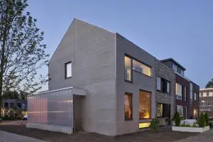 De gevel is een gedetailleerde schoon-betonnen gevel. Een steenachtig materiaal was een eis vanuit de gemeente, iets wat normaal gesproken resulteert in baksteen. Maar hier laat het eindresultaat zien dat er meer kan. De (door de architecten reeds lang gekoesterde liefde voor) Japanse en Zwitserse architectuur vormden de inspiratie voor betonnen gevels die een gevoel geven van textuur, van verfijning.