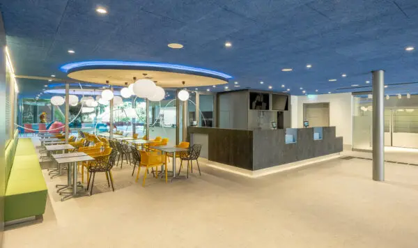 Het kleurenpalet is gebaseerd op sterke tinten blauw, groen en geel om een levendige sfeer te creëren. De gevel heeft een gedifferentieerd uiterlijk: de met planten begroeide plint wordt gevolgd door een geperforeerde aluminium schacht met gekleurde metalen lamellen en glazen elementen. Ook hier domineert een rustig en gestructureerd materiaal- en kleurenconcept.