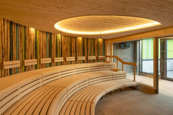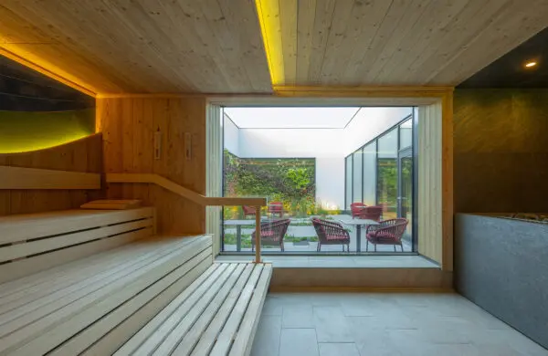 Tot slot biedt het gebouw een saunaruimte met vijf verschillende sauna’s op de bovenverdieping. Het gaat om een sanarium, twee Finse sauna’s (binnen en buiten), een ontspanningssauna en een stoombad. Een atrium met beplanting aan de muren zorgt voor een natuurlijke sfeer, daglicht en een hoogwaardig verblijf. Ontspannings- en openhaardzones, een cateringgedeelte en een buitenruimte met een dompelbad, koude douches en een zonneterras dragen bij aan de variatie.