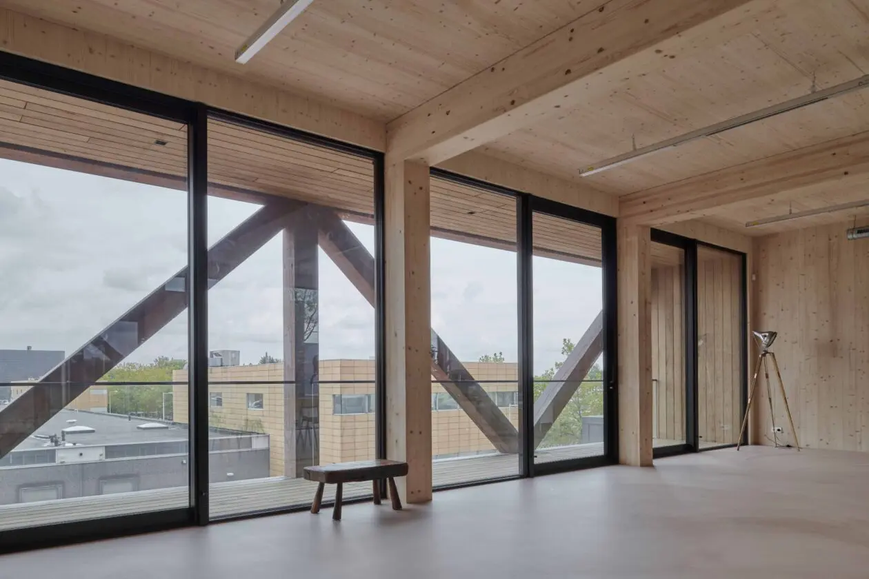 De keuze om kruislaaghout als basismateriaal voor het ontwerp te gebruiken is een logisch gevolg van de samenwerking. Kruislaaghout, ook wel CLT genoemd, is een duurzaam, circulair materiaal dat CO2 opslaat. De demontabele en hernieuwbare kwaliteit van het prefab gedeelte maken daarbij dat het gebouw grotendeels te recyclen is. Er zijn dan ook minimale concessies gedaan op het materiaal.