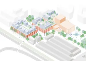 Het nieuwe complex omvat een indrukwekkend productiehuis dat noodzakelijk is voor de grootschalige voorstellingen: repetitie ruimtes, werkplaatsen voor het maken van decors, kleedkamers, kantoorruimte en opslag van attributen. Dit Back of House zal worden verdeeld over drie stadsblokken en vormt zo de basis voor een nieuw stedelijk weefsel. Bovenop de drie stadsblokken zal een bijzonder woonmilieu verrijzen: een opgetild dorp met een nieuw maaiveld op derde verdieping.