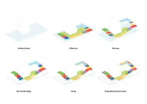 De nieuwbouw bestaat uit een groot en een kleiner gebouw, beide met bijzondere gevel van geglazuurde witte bakstenen, die afhankelijk van de lichtval steeds weer voor een andere aanblik zorgt. In het grote gebouw komt studentenhuisvesting, het kleine doet dienst als parkeergarage en kantoren. Het idee van de gestapelde landschappen keert terug in de getrapte daken met kleurrijke terrassen. Deze terrassen hebben elk een eigen functie; er zijn tuinen, buitensport-locaties, studieplekken en zelfs een bioscoop. Glas speelt als materiaal een hoofdrol, met als doel om het open karakter van zowel nieuwbouw als het originele paviljoen te benadrukken.