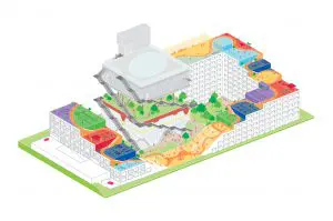 De ‘duinen’ op de begane grond worden omgevormd tot ontmoetingsplek met kleine cafés en expositieruimtes. De eerste verdieping – waar kassen stonden – heeft zijn strakke en rechtlijnige indeling behouden. De voormalige plantpotten zijn op de tweede verdieping van glas voorzien om ze geschikt te maken als vergader- en werkruimtes. Andere elementen die behouden blijven, zijn het bos op de derde verdieping en de opvallend brede buitentrappen. Het dak met de koepel krijgt opnieuw een restaurant.