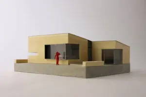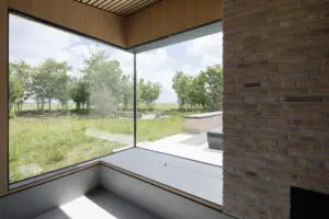 De massa ontleent haar expressie aan het voorgeschreven flauw hellende dak en gevelopeningen op de hoeken. De grote overhoekse ramen in leefkeuken en zitkamer in het zuidoosten maakt dat deze ruimtes zich diagonaal verbinden met buiten. De horizontale snede in de gevel met binnen de verhoogde zitjes en werkplek maakt panoramisch contact met de vergezichten.
