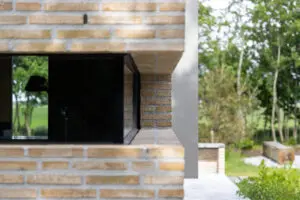 De architect Denkkamer heeft ervoor gekozen om het doorgaans ondergrondse fundament van de woning juist zichtbaar te maken. Een stevig basement waarop de woning staat maar waar ook ruimtes in verzonken zijn. Hiermee is de woning verankerd op het eiland en beschermt samen met het metselwerk het lichte houtskeletbouw.