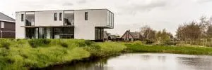Op een groot perceel aan de rand van Heerenveen heeft Lautenbag Architectuur een villa gerealiseerd voorzien van veel glas en een aantal bijzondere elementen. Door het optillen van de woning is een zwarte plint ontstaan die de bovenliggende volumes laat zweven boven het terrein. De entree wordt gemarkeerd door een brede, stoere trap en fraaie houten luifel.
