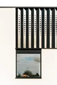 In de gevels is een abstracte verdeling gemaakt, waar open en gesloten vlakken elkaar afwisselen. Boven de entree is een in kleur en materiaal afwijkend vlak aangebracht. De grote gevouwen plaat van metaal geeft een sterk karakter en een dieptewerking aan de gevel. De ronde gaten in deze plaat zorgen op de eerste verdieping voor prachtige lichteffecten en bieden bovendien privacy aan de straatkant. Aan de afwerking van de woning is veel aandacht besteed.