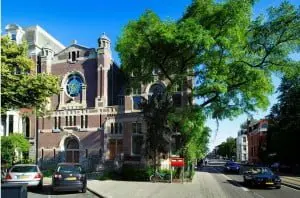 De vrijmetselaarsloge Amsterdam bestond ruim 100 jaar uit 2 gebouwen, waaronder ‘Het Bierhuis’, door de beroemde architect Cuypers in 1873 gebouwd in opdracht van Heineken. In 1893 werd het verbonden met ‘Huize Vondel’ en in 1904/05 naar ontwerp van W. Kromhout verbouwd tot tempel voor de Amsterdamse vrijmetselaarsloges. Huize Vondel kreeg van Kromhout het aangezicht van een tempel, compleet met timpaan. De grote verbouwing van 1910/11 heeft alle oudere bouwfasen grotendeels uitgewist. Naar ontwerp van architect en vrijmetselaar P. Heyn, werd zowel Kromhouts gevel als die van Cuypers afgebroken. Het geheel kreeg een nieuwe gevel in een meer Berlagiaanse stijl, met de twee torentjes, veel bak- en natuursteen en glas-in-lood. Op het middengedeelte het aloude symbool van de vrijmetselarij: passer en winkelhaak met de G van ‘Graad’.
