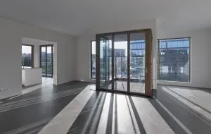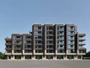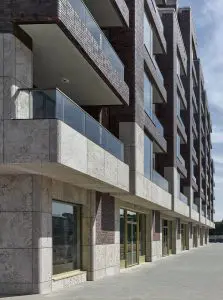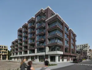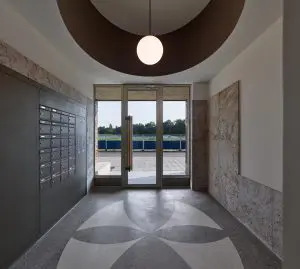 Bijzondere aandacht is uitgegaan naar de ontvangst en gemeenschappelijke ruimten in het gebouw. De natuurstenen bekleding van de plint is hier gecombineerd met terrazzo vloerafwerkingen en gekleurde wandvlakken. Postkasten, natuurstenen bankjes en bijzondere deurgrepen complementeren het beeld. Ze vormen de gastvrije ontvangst voor een woongebouw dat zich voegt in de Amsterdamse traditie van het comfortabel stedelijk wonen.