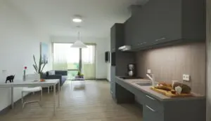 Het ontwerp voor de nieuwe woonlocatie Geert de Leeuw telt 85 moderne appartementen en twee dagbestedingsruimten. Op elke etage zijn algemene ruimtes aanwezig. Denk aan een gezamenlijke huiskamer met keuken en een werkruimte voor medewerkers. Daarnaast is er op elke verdieping een groot balkon dat als terras is te gebruiken. Deze is voor gezamenlijk gebruik.