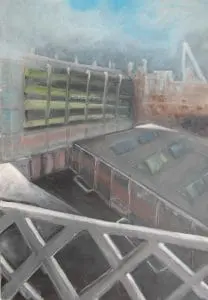 Opmerkelijk in haar oeuvre is de serie van veertien schilderijen die ze maakte van Rotterdam na het bombardement. ‘Ik zag er een filmpje van op mijn laptop. Kleine plaatjes die me direct fascineerden omdat ze zo goed laten zien hoe vervreemdend een kapot gesmeten stad werkt. Ik ben toen ook het merkwaardige ‘dubbele’ van Rotterdam beter gaan begrijpen. Voor de oorlog had de stad een zekere verfijning die na de wederopbouw nooit helemaal is teruggekomen.’ Vergankelijkheid is sowieso een kenmerk van haar werk. Haar jongste serie (in wording) is ontstaan in Detroit. Ze dwaalde er rond langs de gigantische industriële complexen. Ooit met veel optimisme neergezet, maar nu in een steeds verdergaande staat van verval. ‘Die fascinatie staat inderdaad haaks op de orde die ik als architect wil scheppen. Maar toch hou ik van het contrast tussen strak en langzaam verkruimelen in de tijd. Die sfeer van verval probeer ik te vatten in verf.’