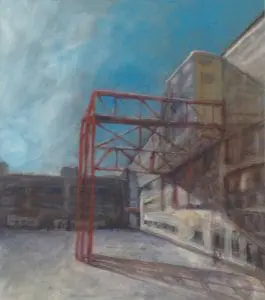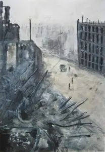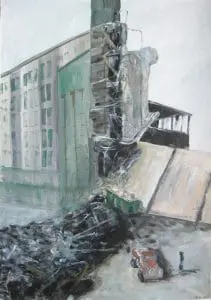 Opmerkelijk in haar oeuvre is de serie van veertien schilderijen die ze maakte van Rotterdam na het bombardement. ‘Ik zag er een filmpje van op mijn laptop. Kleine plaatjes die me direct fascineerden omdat ze zo goed laten zien hoe vervreemdend een kapot gesmeten stad werkt. Ik ben toen ook het merkwaardige ‘dubbele’ van Rotterdam beter gaan begrijpen. Voor de oorlog had de stad een zekere verfijning die na de wederopbouw nooit helemaal is teruggekomen.’ Vergankelijkheid is sowieso een kenmerk van haar werk. Haar jongste serie (in wording) is ontstaan in Detroit. Ze dwaalde er rond langs de gigantische industriële complexen. Ooit met veel optimisme neergezet, maar nu in een steeds verdergaande staat van verval. ‘Die fascinatie staat inderdaad haaks op de orde die ik als architect wil scheppen. Maar toch hou ik van het contrast tussen strak en langzaam verkruimelen in de tijd. Die sfeer van verval probeer ik te vatten in verf.’