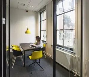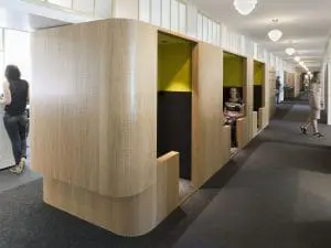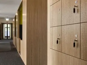 Een multifunctionele Flexkast vouwt zich om de bestaande gangwand. De Flexkast bevat aan weerszijden lockers, postvakken, garderobe, pantry, kopieer-/print-units en overlegnissen. In de open kantoorruimte zorgt het kastmeubel voor differentiatie in werkplekken.