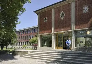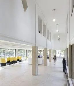 De hoofdentree en de met travertin bekleedde entreehal zijn ontdaan van latere toevoegingen en in oude glorie hersteld. Een vernieuwde ontvangsthal markeert het begin van de hoofdas die de publieke ruimtes en de haaks op deze as gelegen kantoorvleugel ontsluit.