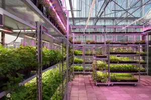 De vertical farming-kas van tachtig vierkante meter ligt op de verdieping, naast de vergaderzalen. Hier worden groenten en kruiden voor de restaurantkeuken geteeld. Een vide in het paviljoen maakt de publiek toegankelijke kas goed zichtbaar vanuit het restaurant beneden. Ook grote groenwanden dragen belangrijk bij aan de beleving van The Green House. Het dak van het paviljoen is gevuld met zonnepanelen.