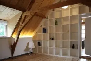 Op de bovenverdieping van het voorhuis zijn onder de dakkap twee moderne kantoorruimtes gerealiseerd. Hier is de kleur van de wanden en het tussenschot van de balken wit gehouden. De scheidingswand tussen de twee kantoren is voorzien van een strakke, open vakkenkast die onder de dakkap schuin afloopt. ‘Zo creëer je veel bergruimte, zonder dat het vol wordt’, legt Nillesen uit.