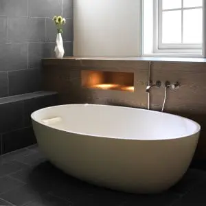 Op de begane grond van het karnhuis is een badkamer, een toilet, een bijkeuken voor huishoudelijke apparatuur en een trap naar boven. ‘De opdrachtgever houdt van luxe en comfort. Niks was te gek en dat is goed te zien aan de badkamer,’ zegt Nillesen. De ingebouwde flatscreen-tv was een must en de inloopdouche heeft een stoomdouche met in de wand een zonnebankelement, zodat je kunt bruinen tijdens het douchen. Langs de achterwand loopt een betegelde zitbank met vloerverwarming. ‘Maar het geheel moest wel mooi zijn, vandaar het strak vormgegeven sanitair en de wastafelombouw van houtfineer.’