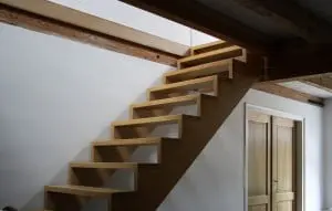 Een minimalistische, houten trap leidt vanuit de boenek naar de bovenverdieping. ‘Een opzettelijke stijlbreuk, die refereert aan de eenvoudige ladder van vroeger.’ De ruimte boven de boenek is ingericht als vergaderruimte en staat via een deur in verbinding met de kantoorruimte boven het voorhuis. Het oude rookkanaal is weggewerkt in een strakke, dichte kastenwand die schuin afloopt onder de dakkap. Aan de ander kant scheidt een brandmuur de ruimte van de koeienstal. Nillesen: ‘Het raam helemaal bovenin versterkt de ruimtelijkheid. Je ziet dat het dak doorloopt naar de koeienstal.’