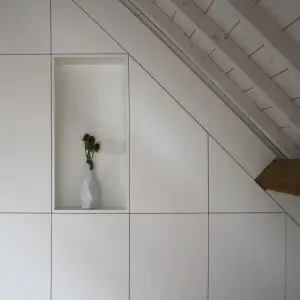 De langgerekte zolder boven het karnhuis en de paardenstal is aan de ene kant in gebruik als slaapkamer en aan de andere kant als badkamer en inloopkast. ‘De ruimte is met opzet niet onderbroken door tussenwanden, waardoor het hele dakvlak en de ramen aan de uiteindes zichtbaar blijven.’ zegt Nillesen. ‘Verder hebben we oplossingen bedacht om de schuine ruimte onder de kap zo goed mogelijk te benutten.’ Zo schuiven in de inloopkast op maat gemaakte kledingkasten als lades naar voren en, net als in de koeienstal, zitten de radiatoren en verlichtingselementen verstopt achter zwevende panelen. In het badkamerdeel is onder het schuine dak een ruime inloopdouche met glazen wanden gemaakt. Recht daartegenover staat een strak wastafelmeubel. ‘Ook hier is weer rekening gehouden met flexibel ruimtegebruik: de grote inloopkast achterin is zonodig om te bouwen tot een extra slaapkamer.’