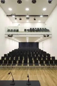 De grote zaal is op de begane grond rechts geplaatst, waar sinds de bouw al een grote zaal gevestigd was. Voor de akoestische isolatie is een doos-in-doosconstructie gemaakt. Het plafond is voor een groot deel verwijderd, zodat een balkon is ontstaan en een passende hoogte is bereikt voor een dergelijk grote zaal. Ook hier is daglicht overvloedig aanwezig dankzij hoge ramen in de achtergevel. Het café is gevestigd in een eenlaagse aanbouw aan de achterzijde. Deze aanbouw bestond al, maar de architect wilde ook hier meer openheid in de beleving.