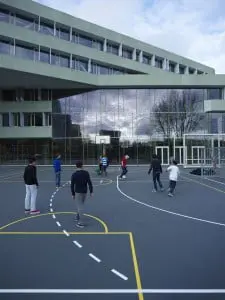 Centraal stond in het hele proces de vraag hoe je een duurzame en flexibele school bouwt. Een voorbeeld van duurzaamheid is dat er betonkernactivering is toegepast. Nadeel daarvan is dat geen gesloten akoestisch plafond toegepast kon worden en dat heeft natuurlijk weer gevolgen voor de akoestiek. Dit is opgelost door het gebruik van zogenaamde baffles, plafondelementen die uitgestrooid zijn over alle plafonds. Niet alleen goed voor het geluid, maar ook nog eens visueel bijzonder.