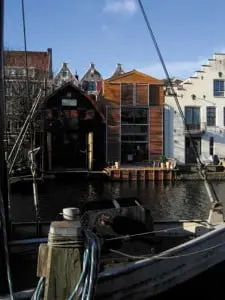 De vorm van het woonhuis annex fotostudio vertoont overeenkomst met het gebouw links van het trapgevelgebouw, al is het wel iets hoger. De gevel is bekleed met western red cedar rabatdelen en sluit daarmee goed aan op de buurman rechts. Aan de straatkant is een frame bevestigd met ellipsvormige, houten lamellen, die van binnenuit te bedienen zijn om de daglichttoetreding te regelen.