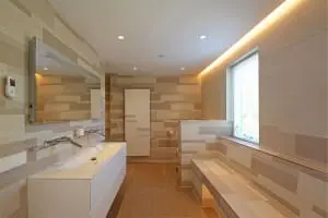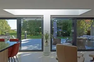 Doordat de daklijn van de nieuwe uitbouw en veranda is verbonden is er een eenheid in de achtergevel ontstaan. Door het ruime dakoverstek van de nieuwbouw is er een veranda ontstaan. De woonkamer met keuken is een ruime leefruimte van meer dan 80 m2. De zithoek aan de voorzijde heeft een open haard en bij de raampartij aan de achterzijde is een ingebouwde moderne gashaard gerealiseerd.