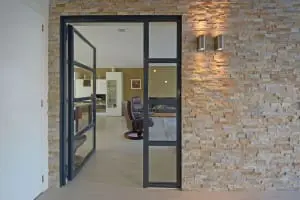 In de hal is een grote vide gemaakt en is een nieuwe eiken trap met een glazen balustrade ontworpen. Een wand is volledig opgetrokken uit drie soorten natuursteen. Een blauw stalen glazen pui met deur accentueert de entree naar de woonkamer. Op de verdieping zijn drie ruime slaapkamers waarvan één slaapkamer toegang heeft tot een ruim balkon. Op de verdieping is ook de badkamer te vinden.