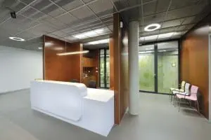 ontplooien. Voor de wand van de behandelruimten zijn beelden van grillige bloemweides ontworpen. Het geeft de wachtenden een panoramisch overzicht en de bezoekers ervaren door de diverse achter elkaar gelegen lagen van de prints de wachtruimte als een zonnige buitenruimte. De vaste inrichting is in wit kunststof en betontriplex.