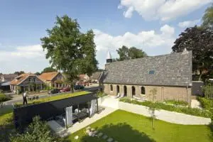 Alle dakpannen zijn eraf gehaald, geborsteld en op de nieuwe isolatielaag gelegd. Het klokkentorentje is ontmanteld, gerestaureerd en herplaatst, het uurwerk loopt weer, zij het op elektriciteit. Naast de kerk is een schuur geplaatst. ‘Het is een zeecontainer, goedkoper kan niet, en we hebben die iets terugliggend ten opzichte van de voorgevel van de kerk geplaatst, want zo zie je die tenminste wanneer je het dorp inrijdt.’ De schutting en de veranda ter weerszijden van de container en de carport aan de andere kant van het gebouw zijn van zwart geolied hout. ‘Daarmee blijft herkenbaar wat origineel is en wat latere toevoegingen zijn.’