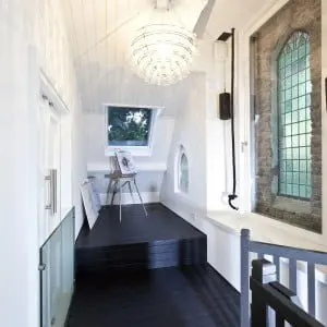 Wanneer je vanuit het nagenoeg originele voorportaal de leefruimte betreedt, zie je één grote hoge doorgaande ruimte, een zee van ruimte en licht. Het portaal leidt ook naar een garderobe en een houten trap naar een ruime overloop op de verdieping, die gebruikt wordt als atelier en logeerruimte. Ook deze ruimte baadt in het licht door een dakraam. ‘We hebben een nieuwe visuele verbinding gemaakt met de kerkzaal in de vorm van openslaande deuren. Die zijn een replica van de oorspronkelijke deuren op de begane grond. Vanuit de woonruimte heb je zo zicht op het glas-in-loodvenster in de voorgevel. De dubbelhoge deuren zijn een ware hemelpoort in een engelenwand. Die engelen hebben we laten printen op vliesbehang, de drukker belde me nog om te waarschuwen dat de resolutie veel te laag was, maar ik wilde juist een grove pixel van 1 cm, zodat het van dichtbij abstracter is.’