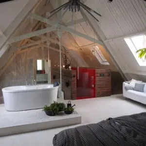 Olthof heeft duidelijk met veel plezier en liefde de nieuwe ruimte vormgegeven. ‘De grote leefruimte sluit goed aan bij onze levenswijze, we zijn graag bij elkaar, willen niet apart zitten en veel dingen in één ruimte kunnen doen.’ Ze hebben veel dingen in het huis zelf gedaan. ‘Het was soms wel monnikenwerk: het schoonschrobben van 4200 dakpannen, het loshalen en bewerken van de originele houten vloerdelen en het leggen van 11.000 eikenhouten latjes op de vloer.’