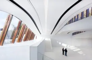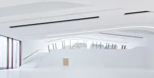 De lichte nieuwe vleugel is eveneens stralend wit. Het dakvlak bestaat uit smalle lichtgebogen banen, waarin stroken daklichten zijn opgenomen, die zo nodig verduisterd kunnen worden. Ze bieden de bezoeker een blik naar buiten en tonen de wandelaars in het park een glimp van het ondergrondse. In de gietvloer onderstrepen marmeren tegelstroken het lijnenspel van het dak nog eens. Zo monumentaal als de bezoekers de ruimte betreden zo onopvallend is de goederenlift weggewerkt in het muurvlak en buiten vakkundig in het plein verzonken. Een patio met grind en berken maakt duidelijk dat er nog meer technische ruimtes zijn weggewerkt.
