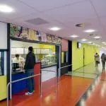 In het Drents Museum is met deze ontvangstzaal een duidelijke scheiding aangebracht tussen de vaste collectie en de tijdelijke exposities. Links geeft een tweede en gelijk gevormde trap toegang tot het historische complex met de vaste opstellingen en rechts achter de deuren begint de nieuwe vleugel met wisselende exposities. Het wit van de uitbreiding van Van Egeraat is voor een klein deel in de oudbouw doorgetrokken om beide delen in elkaar te laten grijpen. Een groter contrast met het voormalige, in neogotische vormen opgetrokken provinciehuis is nauwelijks denkbaar. Het rijk gedecoreerde interieur van de vestibule en de gangen bevat van onder tot boven kleurrijke beschilderingen. De trappenhuizen van de afzonderlijke monumentale gebouwen leiden naar de vaste collecties, waaronder een door ontwerpbureau Opera nieuw ingerichte afdeling archeologie.