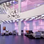 Bij binnenkomst is de oorspronkelijke sfeer nog goed voelbaar. Omgeven door stalen vakwerkspanten, trekstangen, ruwe muren en industriële loopbruggen kijk je door de oorspronkelijke vensters direct naar de buitenlucht. De ruimte is onmiskenbaar authentiek, maar evenzogoed eigentijds door de ingrepen die Visch er heeft gedaan. Niet alleen de drie bioscoopzalen, maar ook de bar en verbindingstrap, zijn opgevat als losse volumes. Hierdoor bestaat geen misverstand over wat oud en wat nieuw is. Elk volume springt duidelijk in het oog, zowel door de vormgeving als door het kleur- en materiaalgebruik. Allereerst is daar het zojuist genoemde, met larikshout beklede, volume van de filmzalen. Deze kraagt uit over de cafézone en heeft met zijn afgeronde vorm een verzachtende werking op de omliggende ruimte. De bar en het noodtrappenhuis zijn samengevoegd in één helderblauw volume. De ticketbalie is hierin duidelijk te onderscheiden door de rode kleur die ook voor de zalen is gebruikt. De stalen trap vormt het sluitstuk van de ingrepen van Visch. Deze verbindt de zaal op de verdieping met de begane grond en lijkt uit één plaat te zijn gesneden. Hier wordt de eenheid nog extra geaccentueerd door de balustrade bewust los te houden van de bioscoopwand en de trap alleen minimaal − ter hoogte van het eerste bordes − met een trekstang te verankeren.