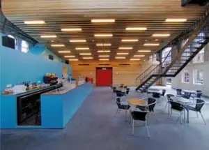 Bij binnenkomst is de oorspronkelijke sfeer nog goed voelbaar. Omgeven door stalen vakwerkspanten, trekstangen, ruwe muren en industriële loopbruggen kijk je door de oorspronkelijke vensters direct naar de buitenlucht. De ruimte is onmiskenbaar authentiek, maar evenzogoed eigentijds door de ingrepen die Visch er heeft gedaan. Niet alleen de drie bioscoopzalen, maar ook de bar en verbindingstrap, zijn opgevat als losse volumes. Hierdoor bestaat geen misverstand over wat oud en wat nieuw is. Elk volume springt duidelijk in het oog, zowel door de vormgeving als door het kleur- en materiaalgebruik. Allereerst is daar het zojuist genoemde, met larikshout beklede, volume van de filmzalen. Deze kraagt uit over de cafézone en heeft met zijn afgeronde vorm een verzachtende werking op de omliggende ruimte. De bar en het noodtrappenhuis zijn samengevoegd in één helderblauw volume. De ticketbalie is hierin duidelijk te onderscheiden door de rode kleur die ook voor de zalen is gebruikt. De stalen trap vormt het sluitstuk van de ingrepen van Visch. Deze verbindt de zaal op de verdieping met de begane grond en lijkt uit één plaat te zijn gesneden. Hier wordt de eenheid nog extra geaccentueerd door de balustrade bewust los te houden van de bioscoopwand en de trap alleen minimaal − ter hoogte van het eerste bordes − met een trekstang te verankeren.