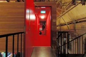 Het exterieur van Het Ketelhuis verraadt weinig van de binnenwereld. Nog steeds staat het stoere fabrieksgebouw onaangedaan in al zijn glorie op het inmiddels trendy Westerparkterrein. Een kijkje door de hoge vensterpartijen maakt echter nieuwsgierig, want hier kondigt zich het interieur al op bescheiden wijze aan. Pal achter het glas duikt een met hout bekleed volume op, dat bij nader onderzoek de behuizing van de nieuwe bioscoop blijkt te zijn. Dit volume is door Visch vakkundig in de oudbouw geplaatst, naar één zijde opgeschoven en op de eerste verdieping voorzien van een uitkraging waardoor op de begane grond een ruime entree- en cafézone overblijft. Het aanvankelijke gebrek aan ruimte levert zo een tegengesteld resultaat op: een overzichtelijk en juist ruimtelijk interieur tegen een fraai industrieel decor.