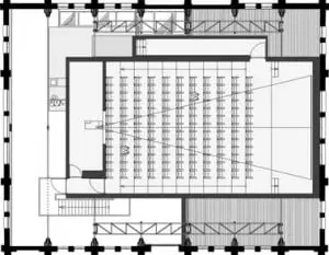 De zalen zelf vormen een sterk contrast met de ontvangstzone. Waar het entreegebied en cafégedeelte duidelijk in verbinding staan met de geschiedenis van het pand en − via de grote vensters − met de ‘reële’ wereld buiten, begint hier de wereld van de fantasie. Afgezonderd en geborgen in een cocon van hout en omgeven door rood tapijt, sluit je je af van de buitenwereld. Voor de lijnen van de plafonds zijn de projectielijnen als uitgangspunt genomen. Hierdoor is er sprake van een letterlijk verruimende blik. Hoewel de beide kleine zalen slechts 50 stoelen bevatten, doen deze daardoor toch ruim aan.