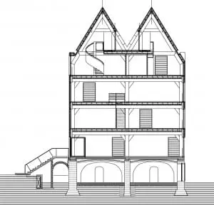 Het oorspronkelijke huis De Wiers had een souterrain en drie verdiepingen onder een dubbel zadeldak. De entree op de bel-etage was voorzien van een statige trap in het midden van een symmetrische klassieke voorgevel. Het nieuwe huis telt vijf lagen boven het souterrain. De gevels en het dak zijn bekleed met koperen losanges, die fabrieksmatig zijn geoxideerd. Doordat gevels en dak zonder dakrand in elkaar overlopen wordt het een abstract volume waarin schijnbaar at random vensters geplaatst zijn. De donkerbruine kleur van het koper benadert de kleur van het oorspronkelijke metselwerk. Afhankelijk van de luchtvervuiling zal de kleur tussen de 50 en 250 jaar behouden blijven. De toepassing van losanges maakt een vrije vensterindeling mogelijk. De bruine ijzerglimmer kozijnen bevatten 1,80m hoge schuifpuien. De buitenzonwering is per verdieping bedienbaar. In open stand zijn de bruine gespoten aluminium lamellen verscholen achter de koperen losanges. Ook de hemelwaterafvoer is weggewerkt: de goten liggen verholen en de regenpijpen bevinden zich achter de gevel in de hoeken. Op de nok voorkomt schrikdraad dat de daken vervuild worden door vogelpoep.