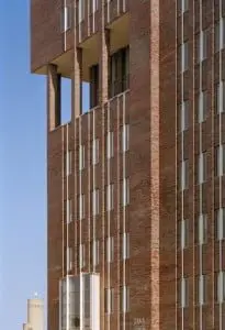 Door de plattegrond licht te knikken ontstaat er overhoeks een scherp aanzicht. De plaatsing van de vensters op verschillende dieptes in de gevel resulteert in een groot contrast tussen sterk verticaal gelede delen en vlakke geveldelen. De uitsparing in de gevel op de vijfde en zesde verdieping reduceert de windhinder rond de ingang. Op deze manier hebben de gevels elk een eigen uitdrukking gekregen, reagerend op de omgeving.