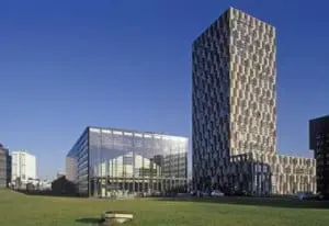 De gevel is het meest opmerkelijke deel van het gebouw. Vanwege het gure klimaat langs de Maas zijn inpandige serres als buitenruimte gerealiseerd, waardoor het monolithische karakter van het bouwblok is versterkt. Architect Luís Pires wilde veel glas in de gevel en geen hoge borstweringen. Zo is een gevel ontstaan met afwisselend langwerpige stroken glas en stroken baksteen in drie tinten: zwart, grijs en wit.