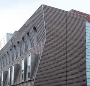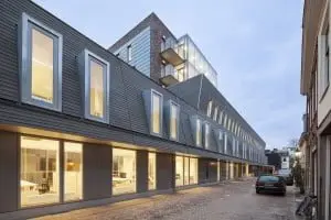 Aan de straat bestaan de gevels op de begane grond uit glas en trespa. Idee was om vanaf de straat doorzicht te geven naar de binnenhoven en vice versa, maar uit privacy oogpunt is dat met matte folie op de ramen weer ongedaan gemaakt. De Visser: ‘De folie is onder druk van de omstandigheden erop gekomen. Inmiddels hebben we een nieuw voorstel gemaakt voor glas met een print, passender bij het totale ontwerp, maar een budget hebben we er nog niet voor.’ De geknikte gevel erboven is met hout bekleed en wordt verticaal geleed door hemelwaterafvoeren en strak omkaderde aluminium vensters. Op deze wijze tracht De Visser de grote schaal van het complex aan te passen aan de fijnmazige omgeving. Het overstek en sterke horizontaliteit benadrukken echter wel de enorme lengte van de straatwand.