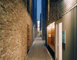 De achtergrens van het complex bestaat uit een doorgaande blinde muur, waardoor het geheel een besloten sfeer ademt, die doet denken aan een immuniteit (ommuurd terrein van een geestelijke instelling waar eigen wetten golden), waarvan er vroeger zo veel in Utrecht waren. Midden in de stad is zo een prikkelarme omgeving voor een besloten gemeenschap ontstaan, die cliënten een rustgevende entourage wil bieden om hun problemen de baas te worden. Achter de muur ligt een gemeenschappelijke binnentuin van een woningcomplex aan de Groenestraat, eveneens gerealiseerd op het oude ziekenhuisterrein in 2008, naar ontwerp van WKG Architecten. De vensters van de woonclusters die hierop uitkijken hebben schuine neggen, om hier meer openheid mee te suggereren.